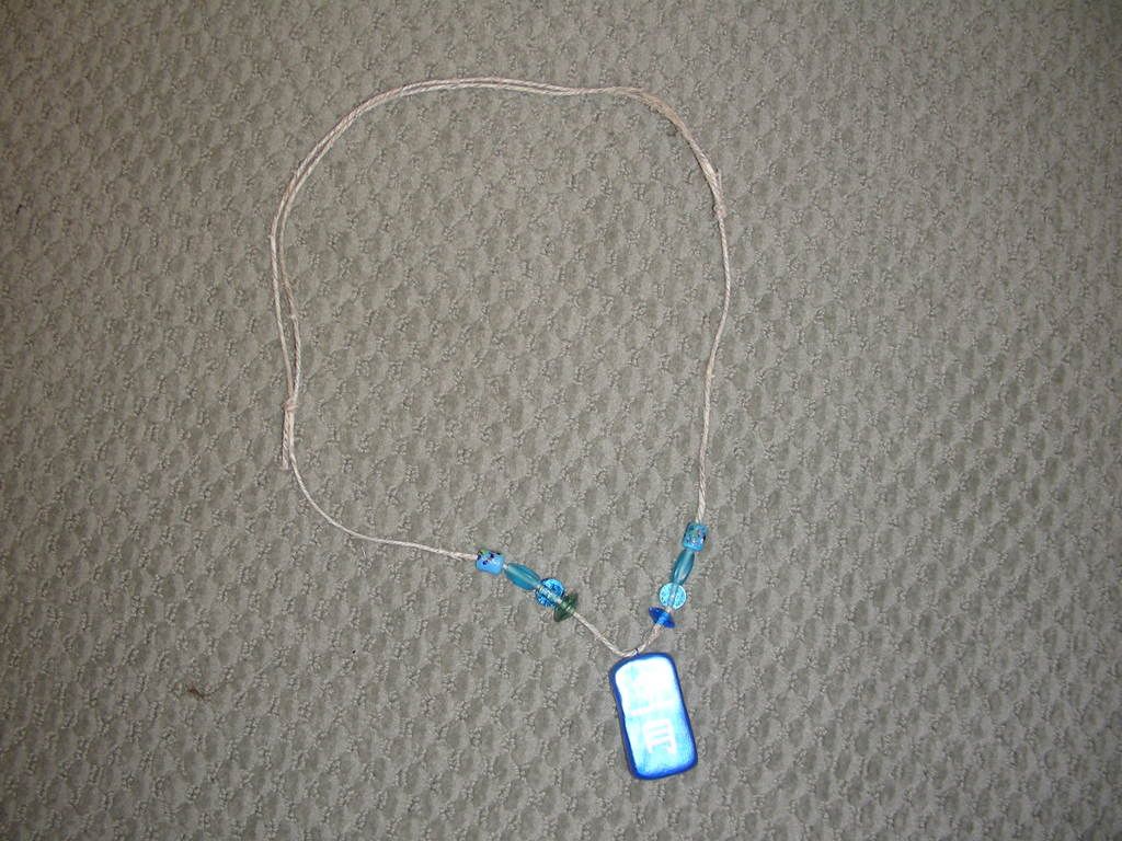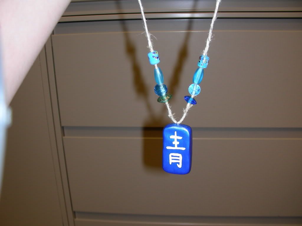 The pendant is made from sculpy (with a jewelry finding making the loop baked in). You can see I didn't smooth out the tinfoil before putting it down... that's why the back has that awful diagonal crease. Boo. I painted it blue, then hand-painted the kanji for "blue" on the pendant. The cord is just plain hemp, but I had to strip down one of the strings that made up the hemp, because it was too thick to bead originally. Glass beads I bought... in some strange mixed bag thing at the craft store. I tied an adjustable knot on the end, and it was done. Nothing fascinating, as you can well see.