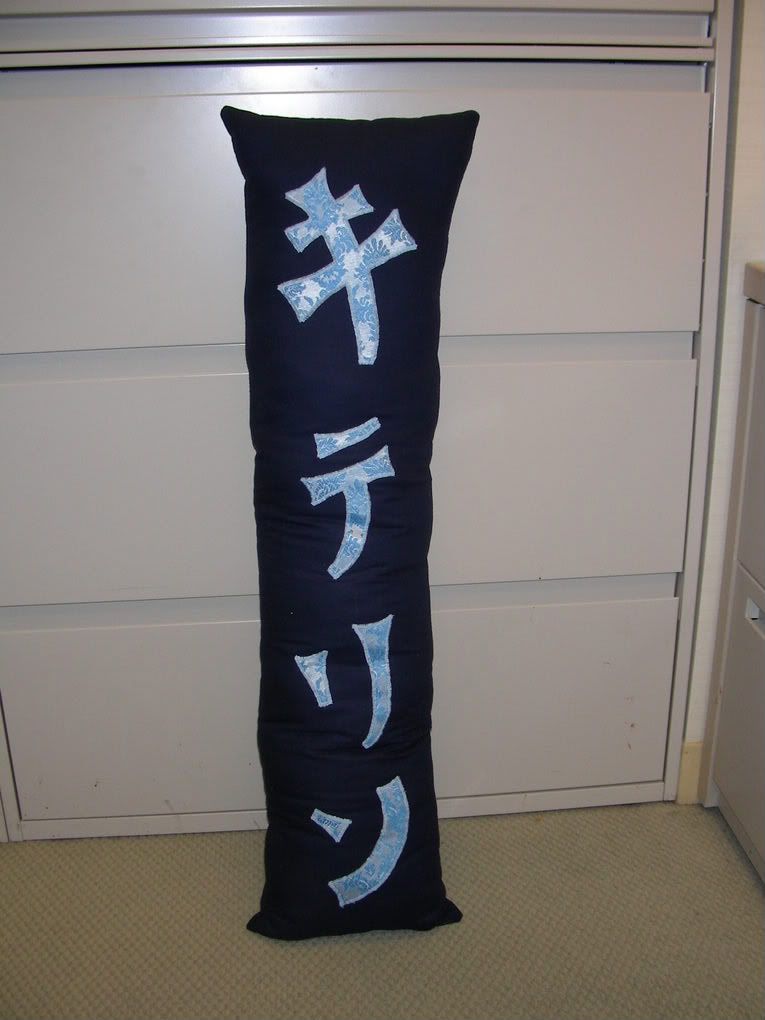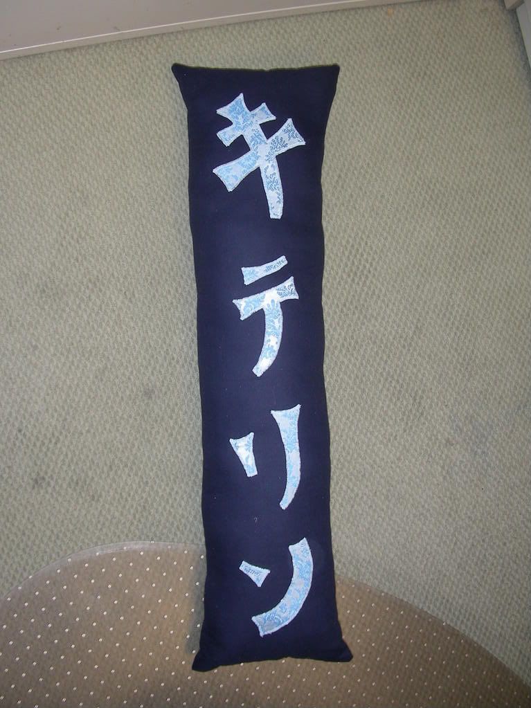 It's very tall and narrow, since it reads top to bottom. It reads Ki-Te-Ri-N. Her username is Caitirin. It's a simple pillow, stuffed as fully as I dared to still allow it to be comfortable. I used... some fabric I had, a sort of... not suiting material but just about? It's fairly soft, a smidge stretchy but nothing to speak of. ::shrugs:: I don't know much about fabrics. The letters are basically appliceed (sp) on with Wonder Under, then zigzag stitched around like you'd find on a letter jacket. The material is some sort of curtain fabric, with a kinda rubbery white backing to it. It worked well, though my machine fought with me the whole way. I didn't take a picture of the bottom, because it sucked... I apparently have no clue how to "properly" close a pillow.