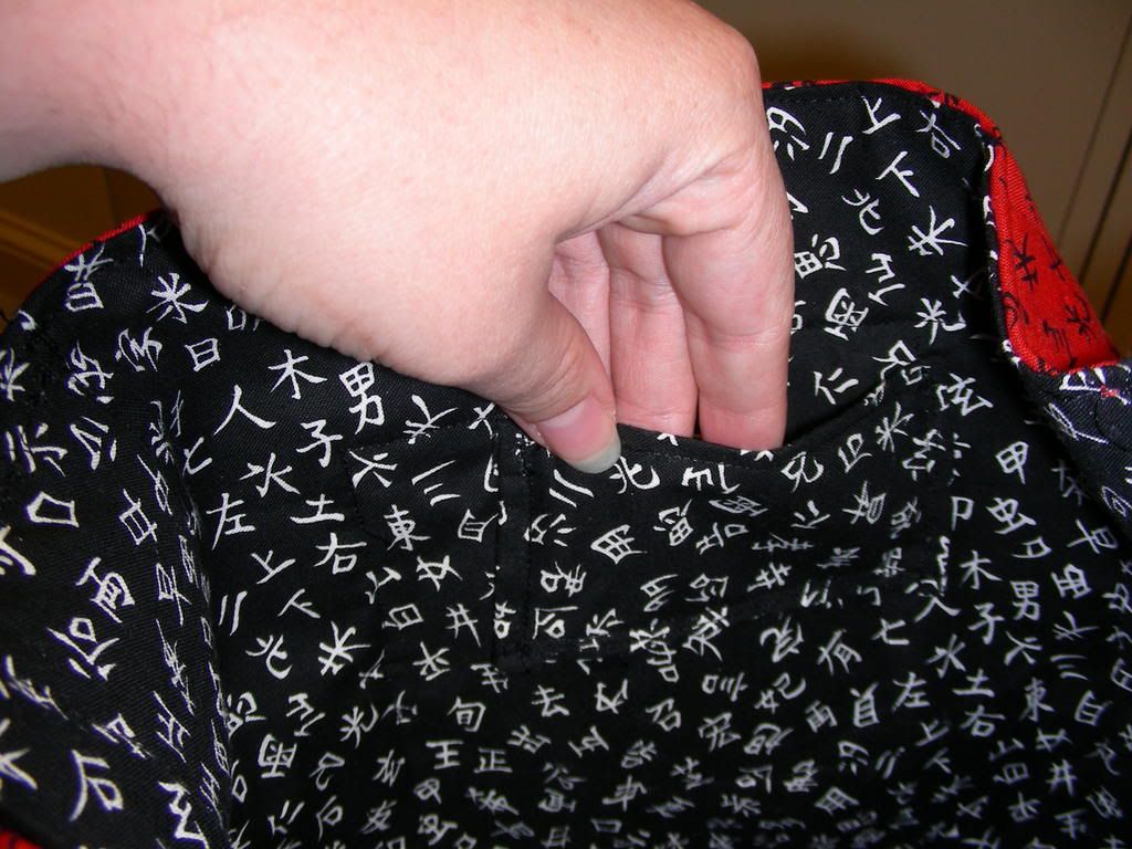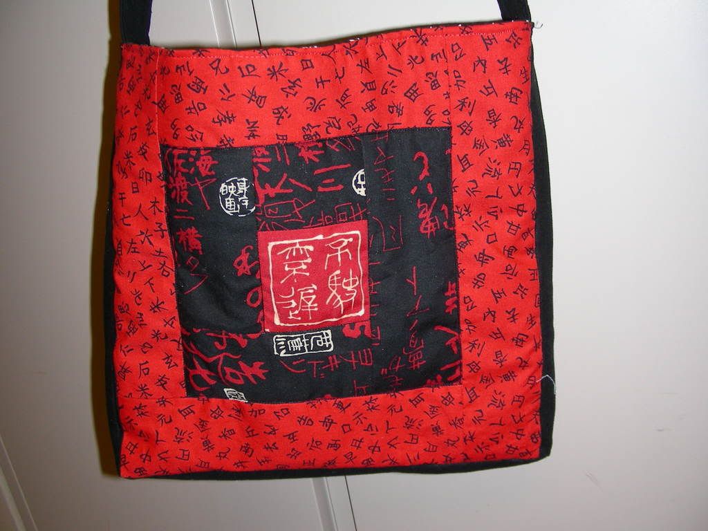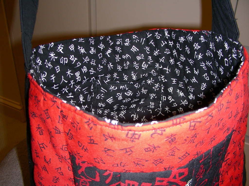The only problem I'd really see are those french seams/raw edges, and putting in the strap. I assume, though, that I can easily peel the fabric from the batting before hemming and insert the strap there, if I really wanted, but then I wouldn't be able to turm the hem there except by turning it inward, which would be different than the edge where I would (I assume) fold it over, given the construction style. After all, hemming the bag was the hardest part for me, because the lining was black while the outside was red. If you look closely, you'll see that the hem actually has a black dot every so often, because I used a red topthread and a black bobbin. That method was, obviously, courting disaster.