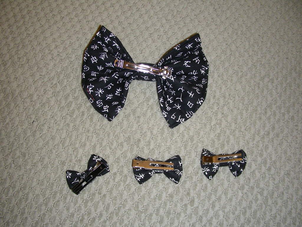 I used the same fusible quilter's batting I used on the purse, and again I only fused... one side to the fabric. Bad quilter! I love making bows like this. I could make them all day. Think of those little 'oragami fans' you would make in school to keep cool? Now pinch the middle. There you go, you have a bow! ::laughs:: The big one is on a normal clip, and the little ones are on small clips I usually use for my horns. They were a pain to keep on there, but a bit of E6000 and a ton of stitching did the trick.