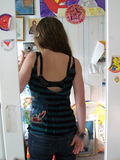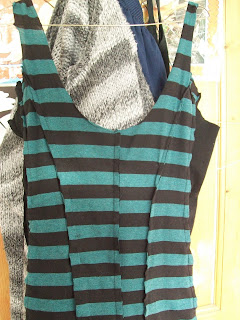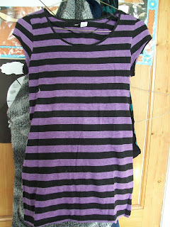 The purple top is what it was originally shaped like. I used this tutorial, which is simple (to follow and to do) and is cheery and has puns and is a very good starter if you're scred of the sewing machine! I was a bit careless in following it exactly - it said to cut fourteen inches up the front, and since I used a rather long top, that didn't leave much fabric at the top of the front. Happily, it said to cut sixteen inches up the back, so I used that as the front and shortened the sleeves by a few inches. Modesty prevailed, boobs lost the day. I also had to use a black t-shirt to make the panels at the side, given that I overestimated how much width the stripy top could lose and still be wearable.