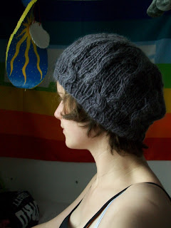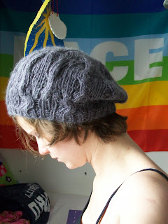 Made using the Star-Crossed Slouchy Beret pattern (another Rav link) with Rowan Cocoon, which is a lovely yarn. When I blocked it it became rather gigantic, but then the weather improved, so it's been put on the long finger until Winter rolls around.