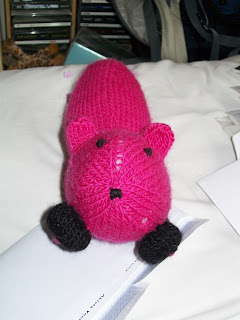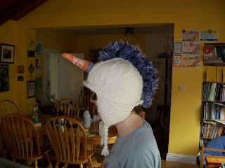 I used the same pattern for this, then crocheted two fluffy yarns held together for the mane (more of a mohawk, but that's good too) and knitted a cone for the horn.