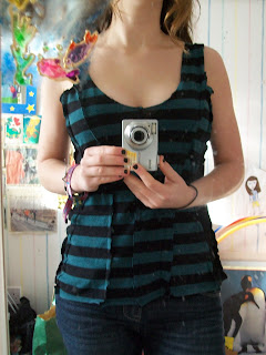 The purple top is what it was originally shaped like. I used this tutorial, which is simple (to follow and to do) and is cheery and has puns and is a very good starter if you're scred of the sewing machine! I was a bit careless in following it exactly - it said to cut fourteen inches up the front, and since I used a rather long top, that didn't leave much fabric at the top of the front. Happily, it said to cut sixteen inches up the back, so I used that as the front and shortened the sleeves by a few inches. Modesty prevailed, boobs lost the day. I also had to use a black t-shirt to make the panels at the side, given that I overestimated how much width the stripy top could lose and still be wearable.