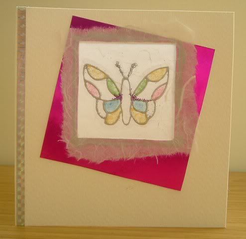 The cards are a creation in Cardstock, mulberry paper, acetate, glass paints, glasspaint outliner, glue, embroidery floss, lots of glitter, sequins, funky foam, coloured pencil, beads, ribbons, knitting and anything else I found hanging out in my craft drawer!