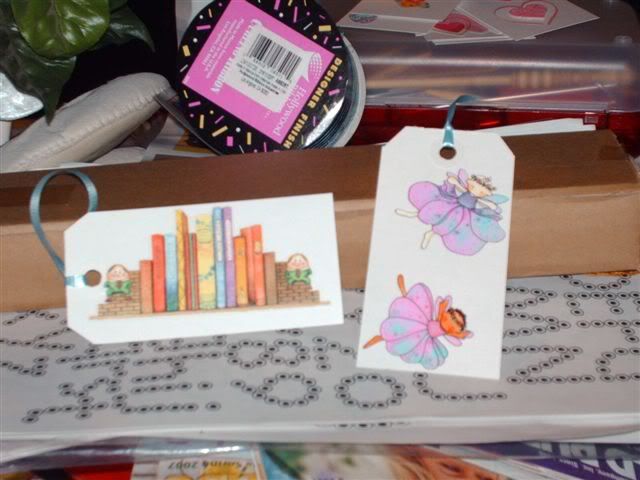 I bought tons of these die cut book mark shapes, and then got burnt out on the intended purpose, plus intended purpose didn't work out to well, so I turned them into book markers. I got the stickers at the dollar store. And instead of like 2 bucks a yard for silk cord, I got gift wrap string* I guess that's what you call it.* Yes the pictures on some are blurry.that's not the point of the post though:)