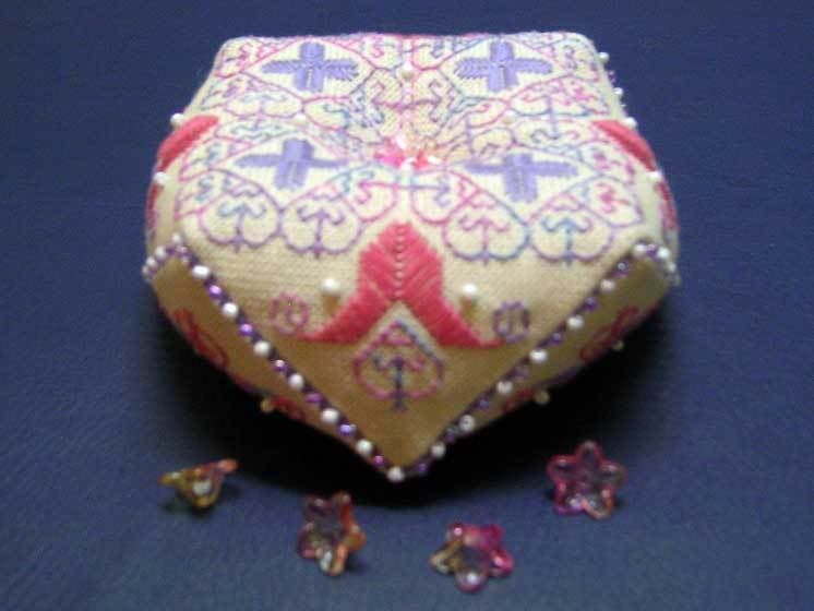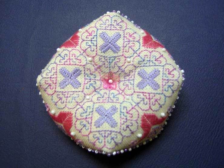 Beads: Translucent light purple plastic beads on the side, with alternating solid white for contrast. Center is a translucent cupped flower bead, which I found by pure luck! Imagine I found it in a stall between one that sells cheap electronics and another that sells ove the top accessories. LOL I thought the beads were perfect for the biscornu!