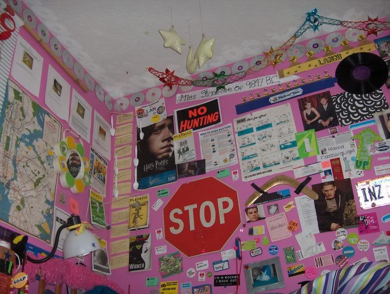 i've spent 7 years working on "decorating" my room. this photo was taken last year, and now that i've moved off to college, the walls are BLANK because my sister's moving in. it makes me so sad when i go in there now, it was like a huge work of art to me.