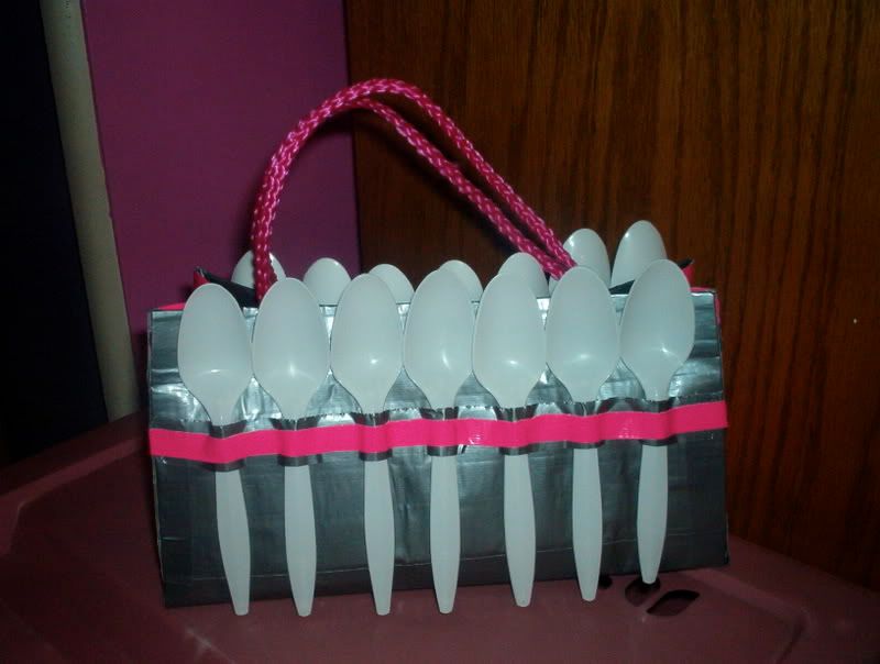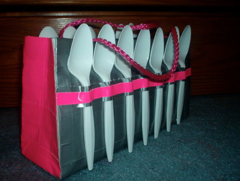 my friend asked me to make her a purse out of spoons and duct tape for her birthday last year, so i complied. i loved making this. i had never made a purse before, but i think it turned out nifty.