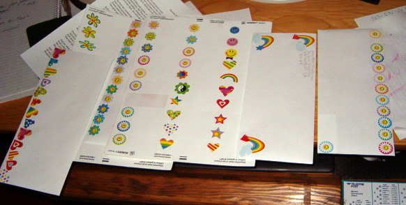 The mailing lables would be a pain in the butt to print on my printer like I originally wanted, so I simply bought some cute stickers that were small enough to fit on the lable, some envelopes and I put stickers on the envelopes, the lable will colaberate with the envelope:) so the smiley envelope will get a smile lable:)