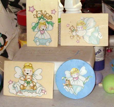 I just took some cute stickers and put them onto the wood shapes I had, and they came out so cute! I don't know if I am going to paint the unpainted ones probably not.