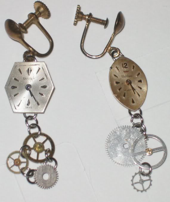 I was dying to find a place that sold clock gears, but I couldn't find any--and then I stumbled across this tiny junk store that sold old pocketwatch movements and wristwatch faces. Like MAGIC you guys, seriously. I only bought two movements, and I could only get one open to play with the guts. (I made the other into a pin that I didn't get around to taking a picture of, but it's pretty sweet.) Anyway, the result: